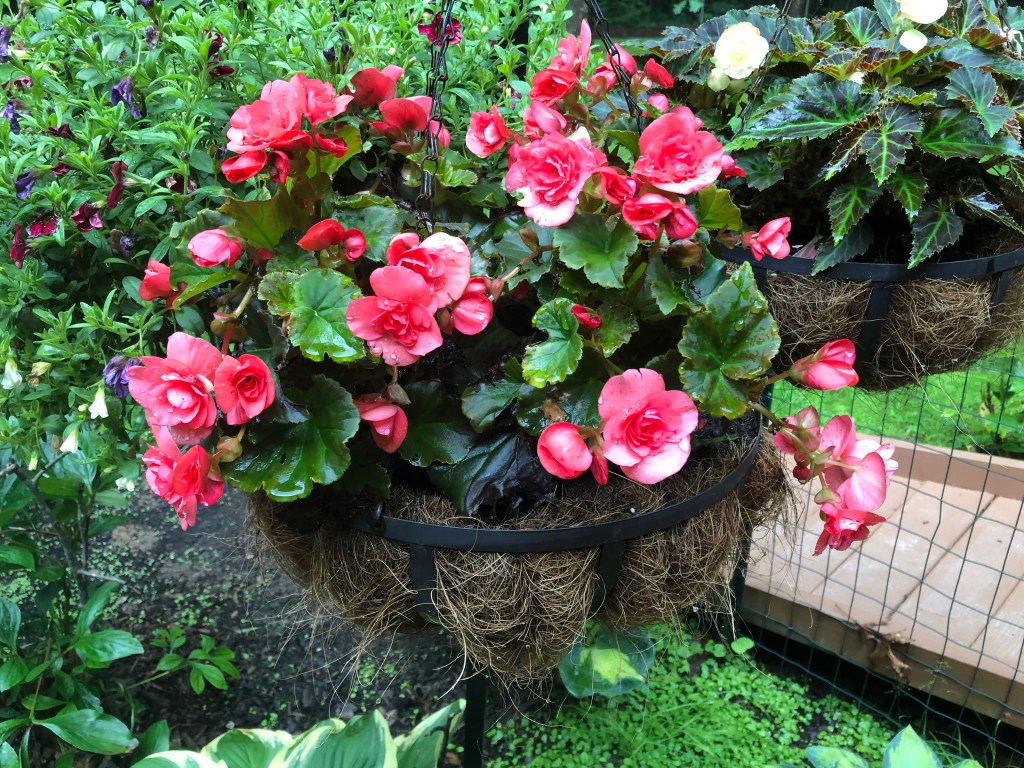 Good morning, everyone. Come right through the house and back to the deck. It’s such a wonderful weather day that I thought we would enjoying sharing our hot beverages on our deck. The weather couldn’t be better after a horrendous heat wave this week and a big storm last night. Thankfully, we sustained no damage. Grab a coffee or tea. There is a real selection today including French press, Jamaican, and more along with some fabulous green tea. But, first, a picture of my rose begonias in full bloom. These are annuals where I live.