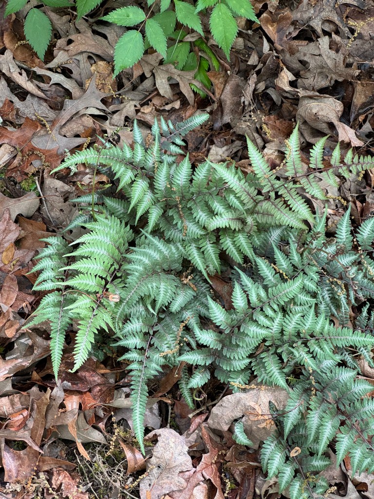 From left: Japanese painted fern, (not sure of variety of fern), hostas